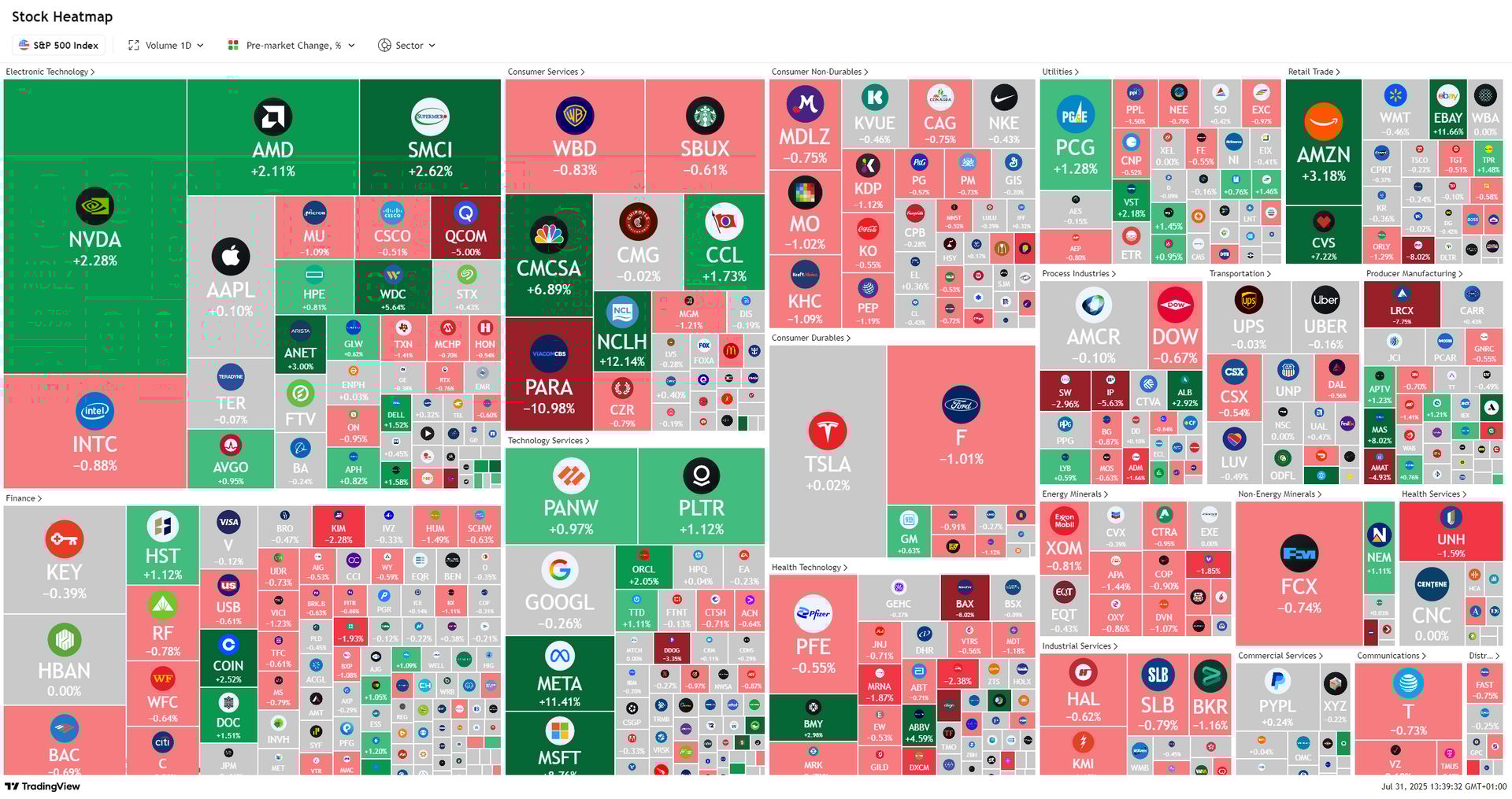 Huge gap up this morning on the back of the mega tech Results last night. Hard to be bearish at all here but I would be careful of FOMO at the open. We will likely see some profit taking in the big names. These are simply massive overnight moves and are concentrated in the Mega cap names as can be visualized in the heat map below. It’s also the final day of the month which can be a strange day in the market.