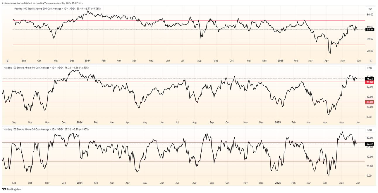 This has been an extreme run but any metric. Some breadth charts here that I like to refer to put that in perspective. We are certainly due a pullback or at least some choppy action. I’m still watching the individual stocks but the follow through on many names is hit and miss and the likelihood of turbulence increases as the macro news gets more uncertain - Tariff Court Case, Tariff Deadlines etc.
