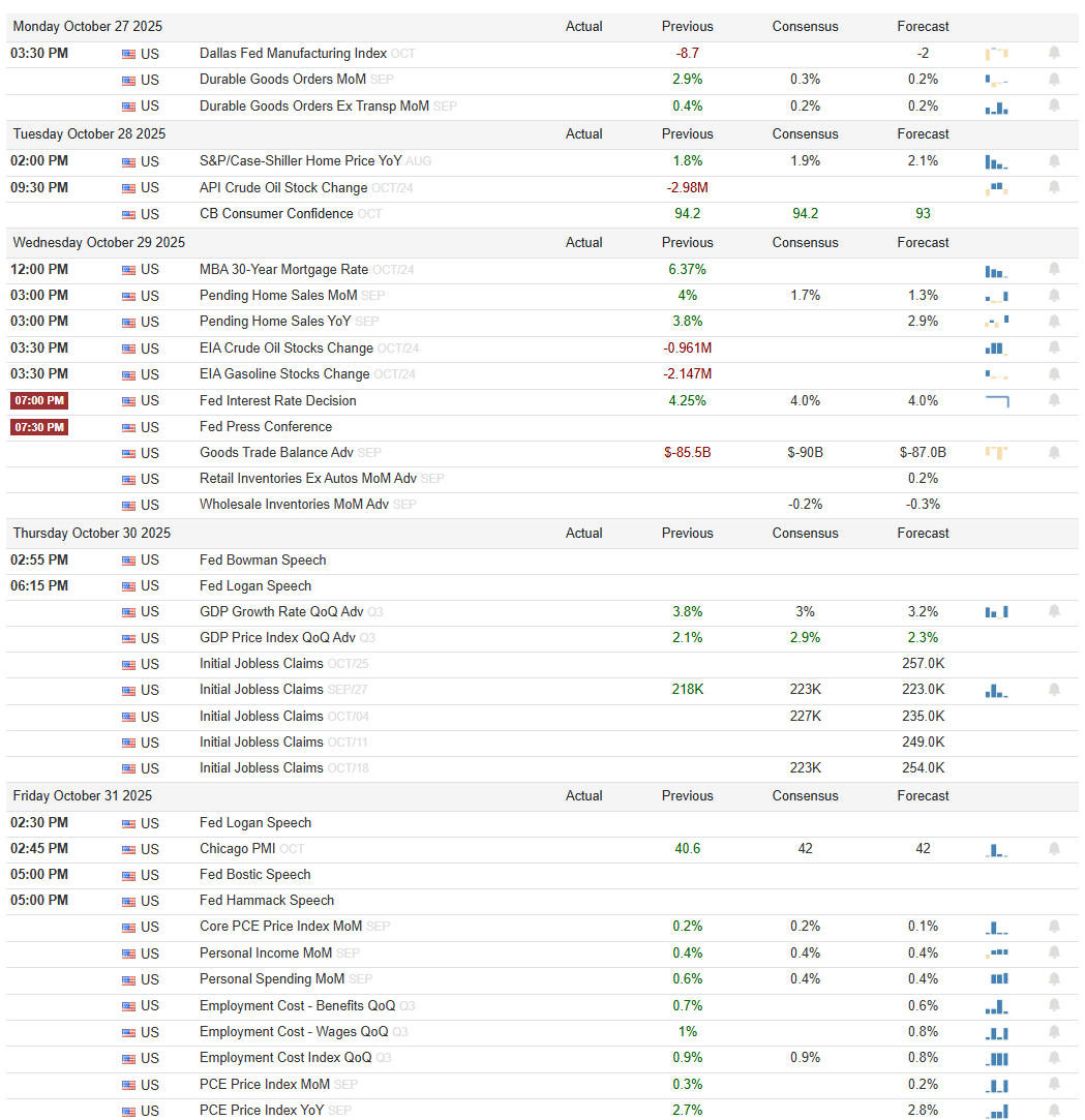Another big macro week. The pinnacle being Wednesdays FED Decision at 7:00pm EST. On Friday we have several FED speakers. With the government shut down I’m not sure how many of the other expected numbers will be published. Macro is not something that I’m overly thinking about this week. I think it’s probably not going to be a big surprise. I think earnings are more important to the market.
