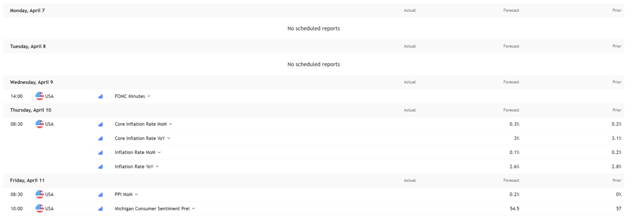 FED Minutes on Wednesday and CPI Thursday make the back half of the week very Macro heavy when you take in banks earnings and PPI on Friday morning also. Expect plenty of volatility. Everyone wants the FED to announce cuts but if you listened to Powell last week then that seems unlikely. It will be more of the same narrative.