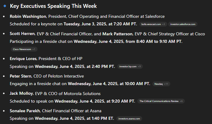 Now that earnings season is over we have conference season in full force. Jeffries Global Healthcare, Bank of America Global Technology and Baird Global Consumer Tech & Services being the main ones that I’m looking at. It’s always worth knowing who is doing the Keynote’s and Fireside chats at these conferences. ChatGPT can usually tell you.